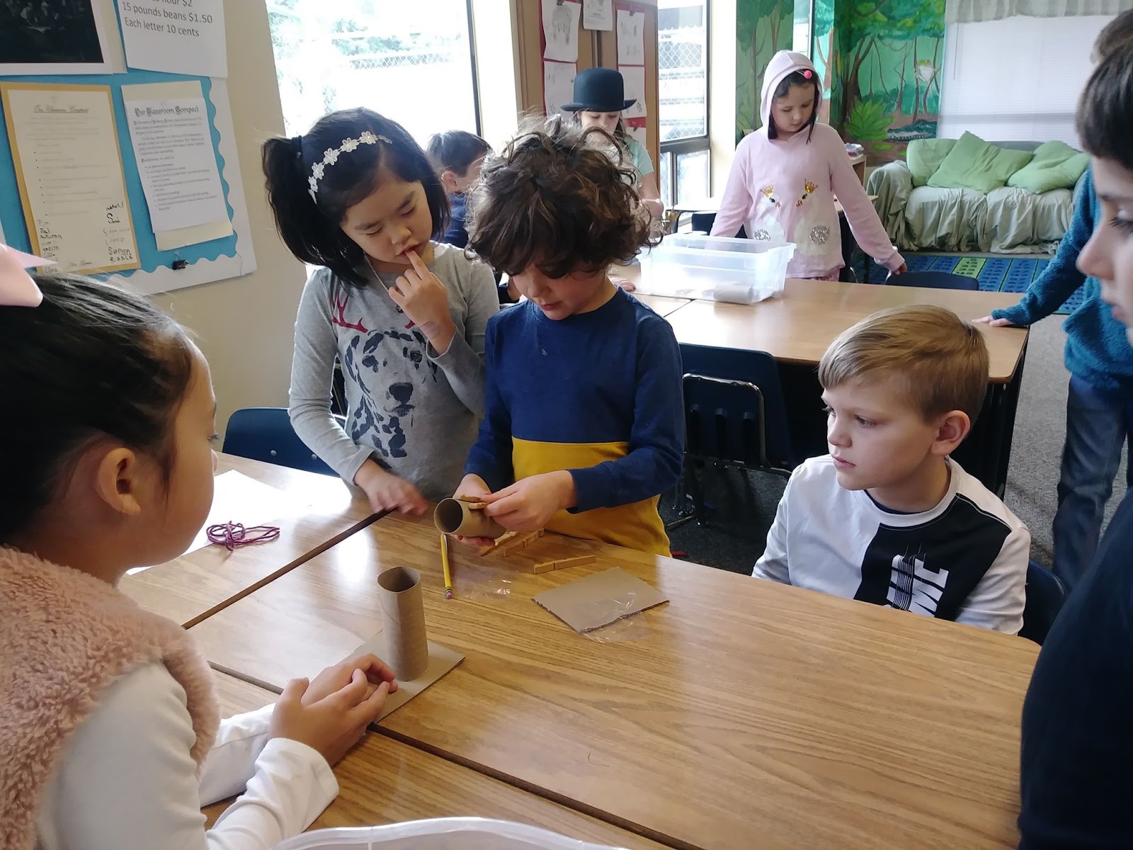 Supplies included clothespins, a toilet paper tube, one yard of string, and scraps of construction paper.